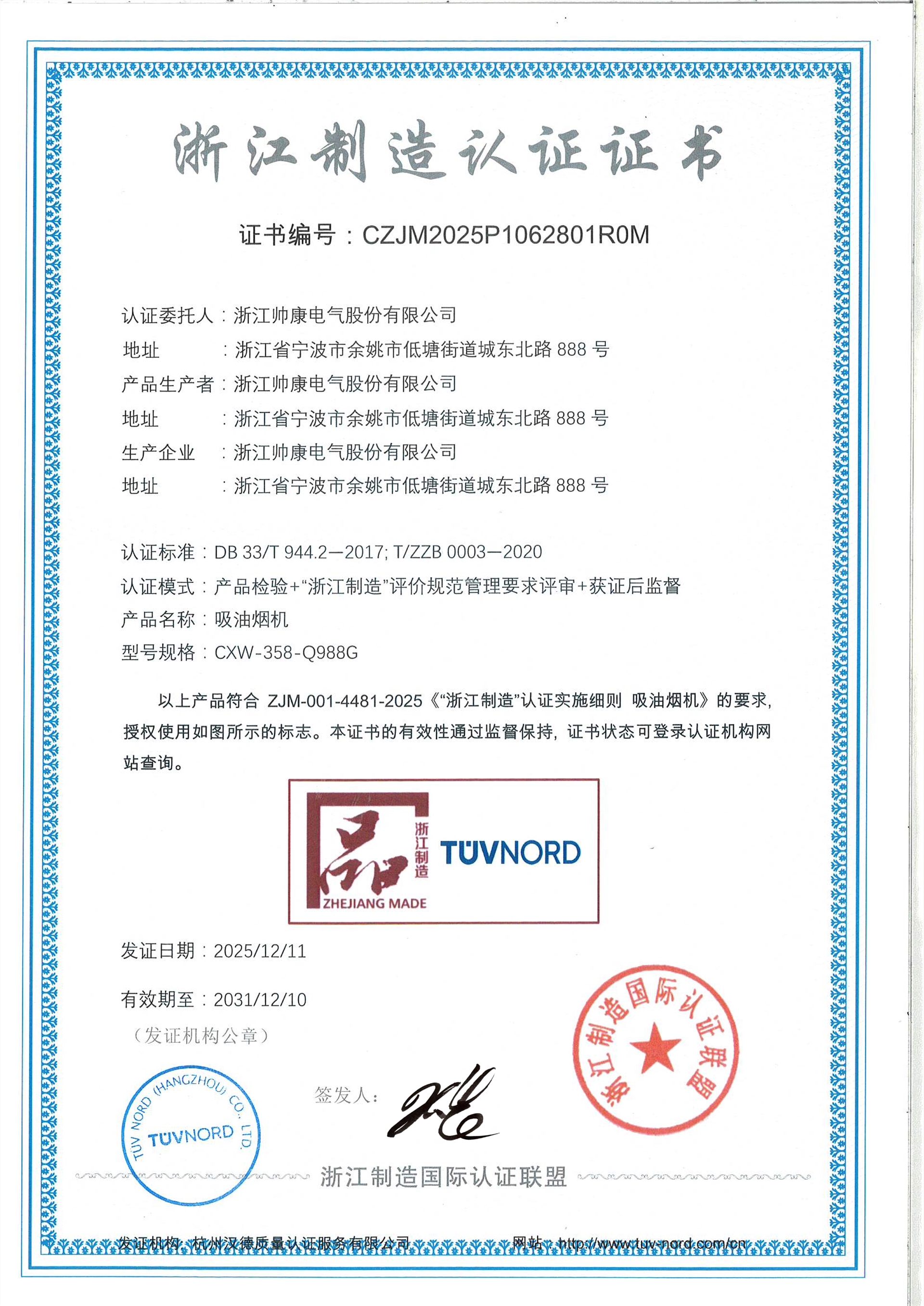 “浙江制造·品字认证”由浙江省政府主导,以“国内一流、国际先进”为基准,覆盖产品质量、技术水平、工艺工法、节能环保等多维度考察标准,要求在技术指标上超越国标和行业标准,是高品质、高可靠性、先进性的权威象征。帅康凭借41年在厨电制造的积累与突破,形成了涵盖国家级“绿色工厂”、五大产业基地、300万套年产能的完整制造体系,构建了卓越产品品质的制造基础。