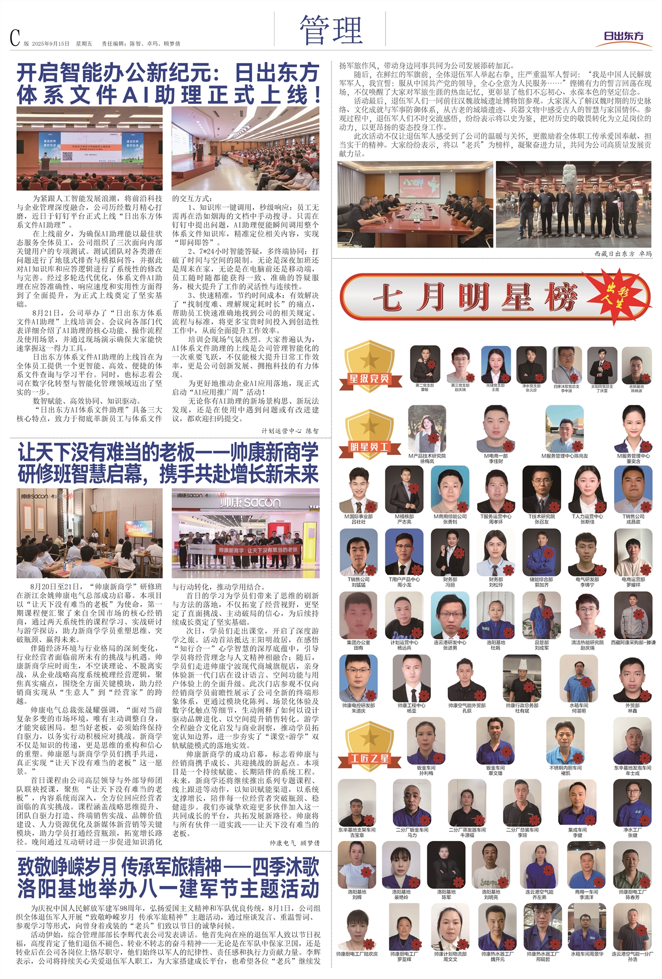日出东方管理 开启智能办公新纪元:日出东方体系文件AI助理正式上线! 让天下没有难当的老板——帅康新商学研修班智慧启幕,携手共赴增长新未来 致敬峥嵘岁月 传承军旅精神 ——四季沐歌洛阳基地举办八一建军节主题活动