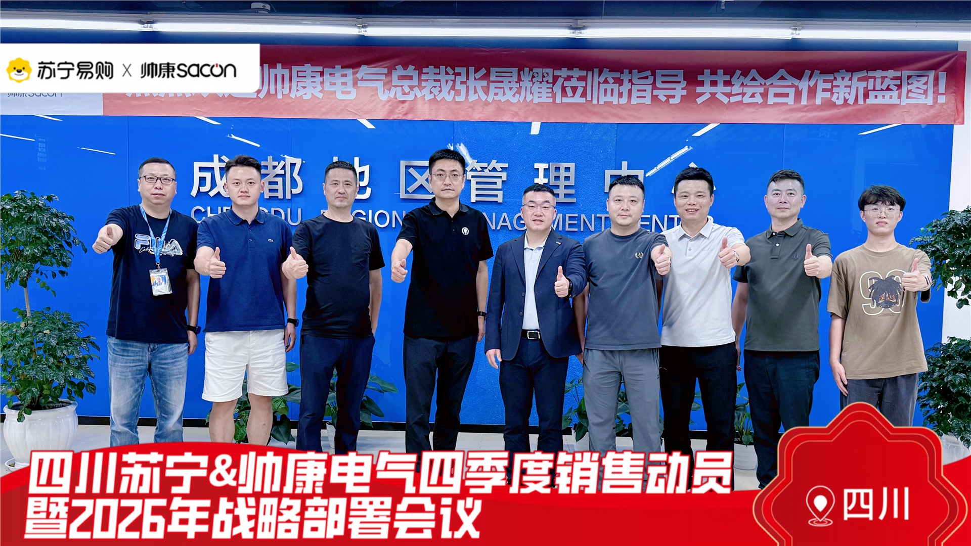近日,帅康电气总裁张晟耀率核心团队亲赴成都,与苏宁易购成都地区管理中心总经理朱强发等高层领导共同出席“四川苏宁&帅康电气四季度动员暨2026年战略部署会议”。双方围绕市场布局、产品策略与渠道建设等展开全面沟通,为未来的协同发展奠定坚实基础。